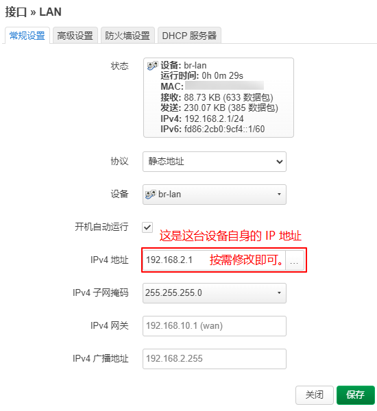 打开“网络”-“接口”,进入 LAN 口配置界面,在“常规设置”选项卡,将“IPv4 地址” 改为需要的IP即可。