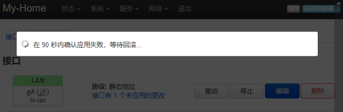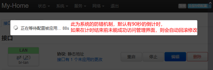 注意:网页界面有防错机制,每当应用了新的修改后,有 90 秒倒计时,当你修改了 LAN 口 IP 地址后,需要使用修改后的 IP 再次成功访问管理界面,否则超时后会被自动回滚修改。