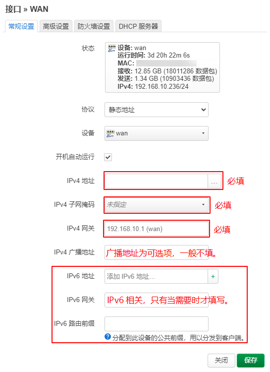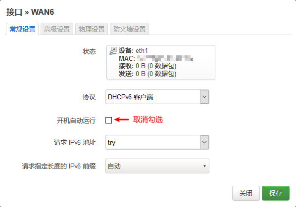 - 如果是二级路由(网关),则需要“停止” WAN6 接口,并取消它的“开机自动运行”,或者删除 WAN6 接口。