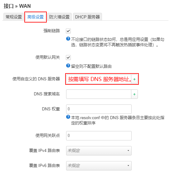 默认使用网关 IP 作为 DNS 服务器,如果网关不提供 DNS 服务,或者你想使用其它 DNS 服务器,则前往 “高级设置” 选项卡,按需添加自定义 DNS 服务器。