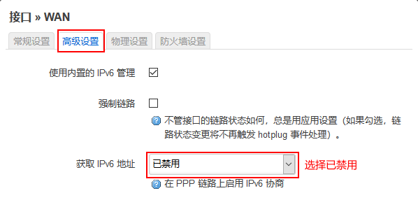 - 如果是自动拨号的一级路由,则需要修改 WAN 接口,在“高级设置”选项卡,将“获取 IPv6 地址”设为“已禁用”。