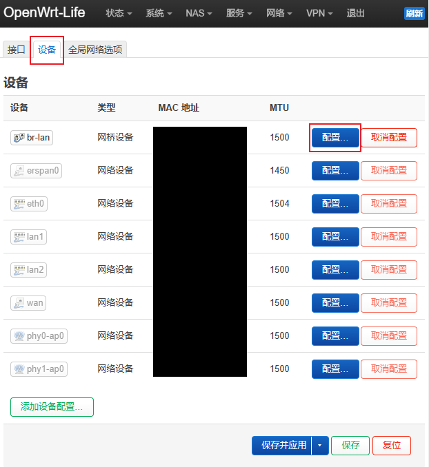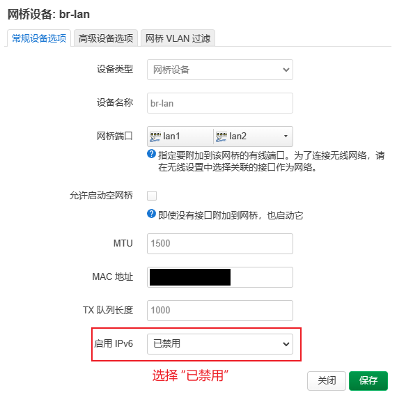 如果你需要禁用 LAN 口的 IPv6 服务,则需要前往“网络”-“接口”-“设备”选项卡,按需关闭对应接口的 IPv6 功能即可,默认局域网设备为 “br-lan”,则参照下图设置。
