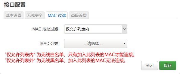 “仅允许列表内”为白名单,只有加入此列表的 MAC 地址才能连接,