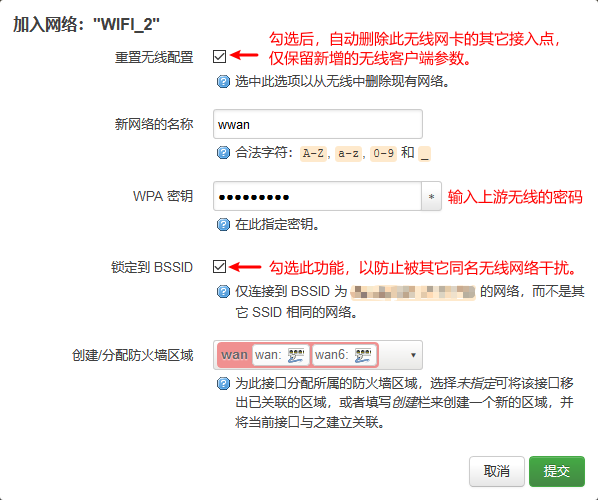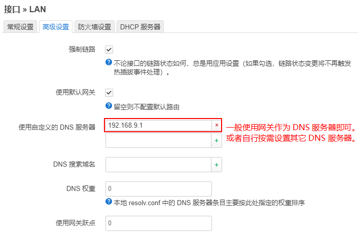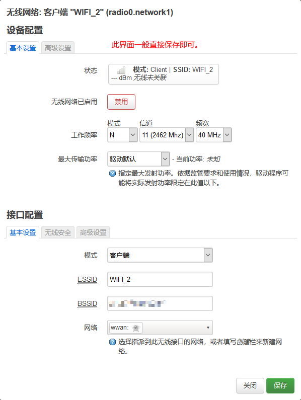 即手动配置“接口”参数,将连接上游无线网络的接口加入到 “lan” 接口中,并关闭本机的 DHCP 服务,以实现和上游网络同网段的效果,适用于高级用户。