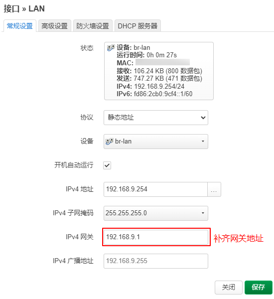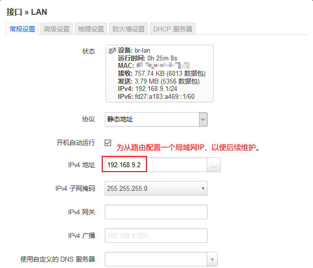 然后开始配置“从路由”,修改“从路由”的 LAN 口地址,为其固定一个同网段的局域网 IP,不可与局域网内其它设备冲突。