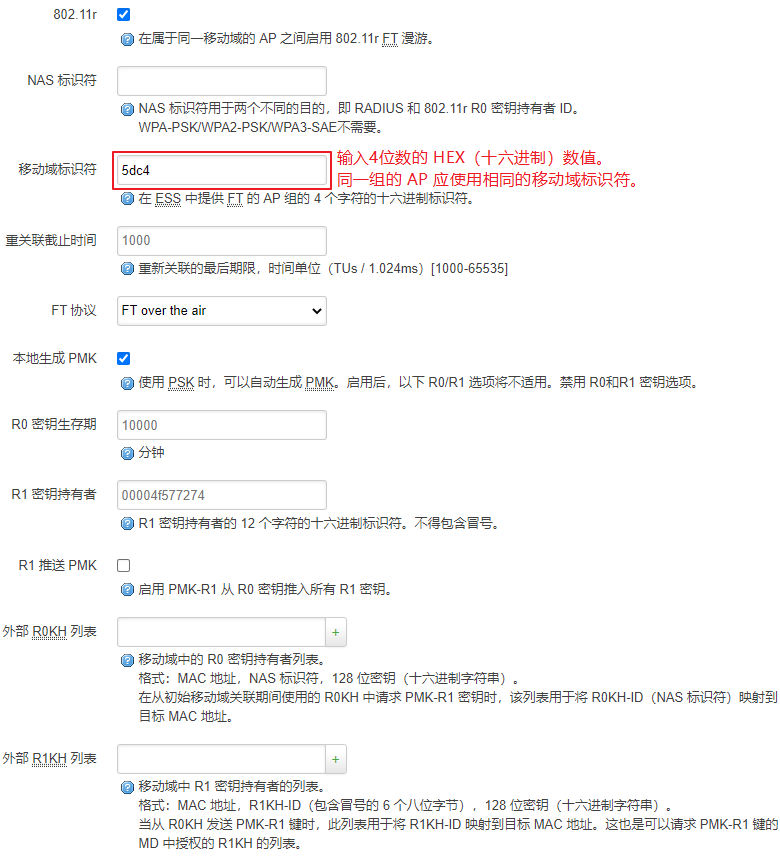 注意:“移动域标识符”用于将多个 AP 进行分组,同一组的 AP 应使用相同的“移动域标识符”。