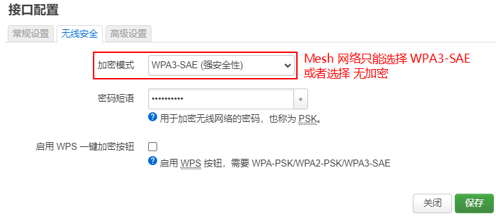 注意:Mesh 网络的加密方式只有两个选择,无加密或者 WPA3-SAE