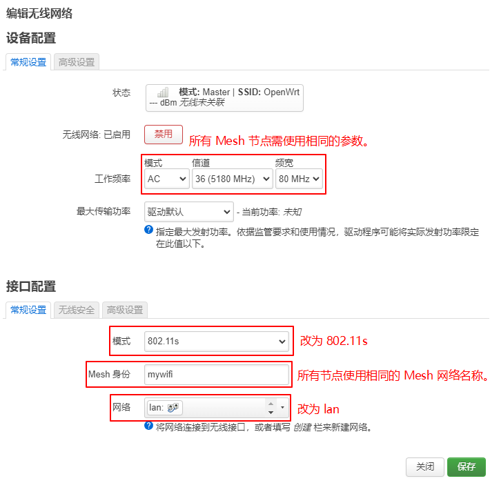 因 Mesh 网络的组网特性,不区分主从路由,所有参与组网的设备称其为 “Mesh 节点”,只需在相关无线网卡添加对应的 Mesh 网络参数,任意一个 Mesh 节点能联网即可。